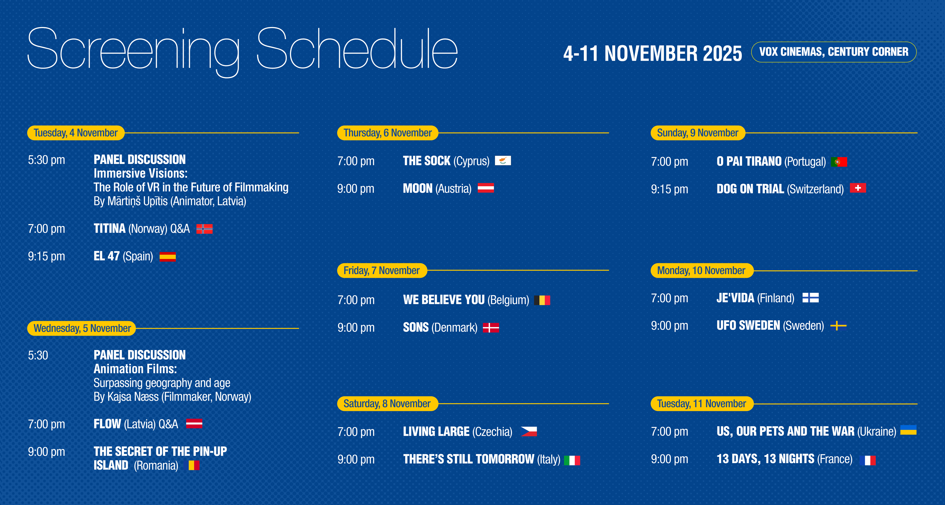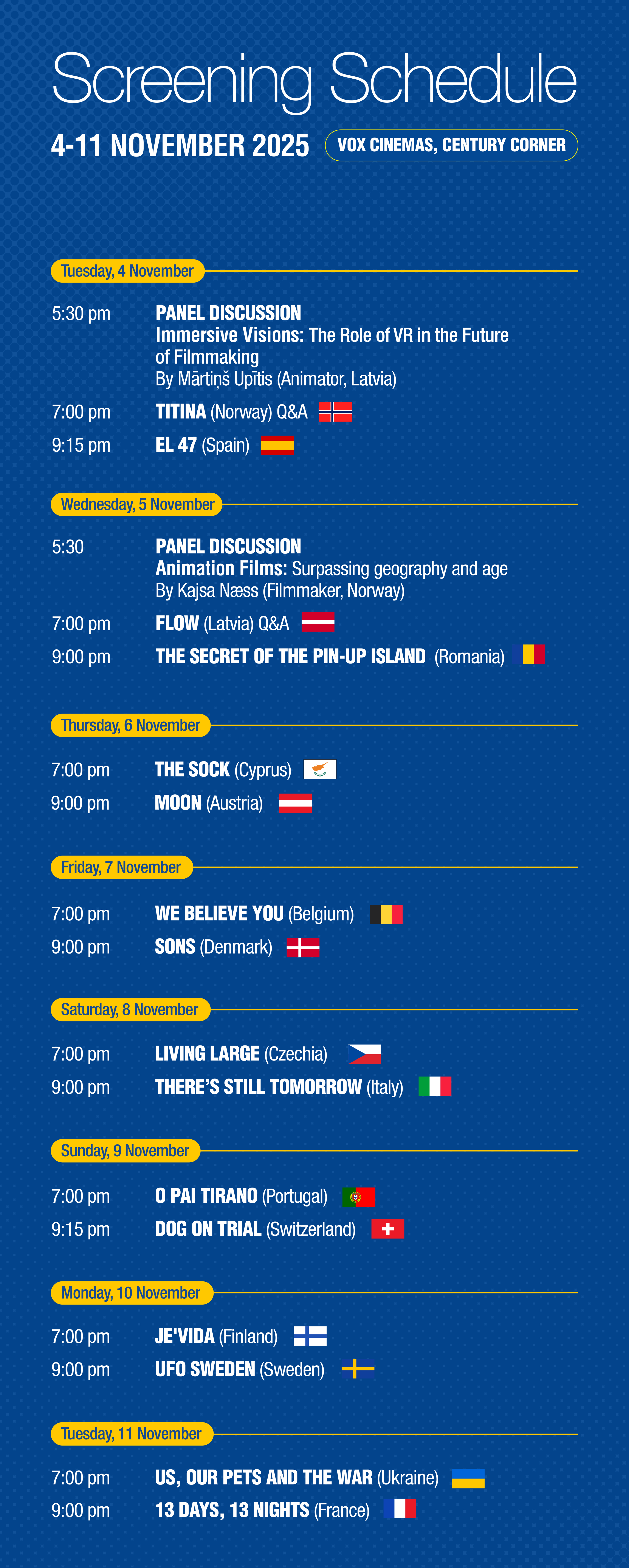 From documentary filmmaking to heartfelt fictions, the selection of the 4th edition of the European Film Festival will offer our audiences a rich and diverse palette of not only genres but impactful storytelling. Many of the selected films have an inspirational message: be it to overcome any disabilities you may have, be it the empowerment of women or be it the ongoing fight to save our environment. Other stories will be very entertaining in showcasing thrilling adventures and comic reliefs. We're looking forward to a successful 4th edition!